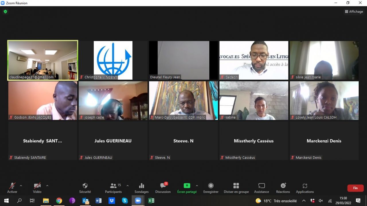 Dans le cadre du projet IMPLIC « IMPLICation et participation des acteurs pour la protection des droits des personnes privées de liberté », soutenu par l’Union Européenne et mis en œuvre par ASF France et le CALSDH, se tient du 28 au 30 mars 2022 la première session de formation du projet, animée par deux formatrices, membres bénévoles du pôle expertise d’ASF France. 13 avocats membres de notre structure partenaire du CALSDH ont été réunis, pour une activité organisée en distanciel, étant donné le contexte actuel en Haïti.